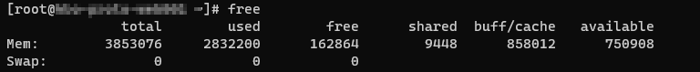 2. free 명령어를 통해 현재 Swap Memory를 사용하고 있는지 확인한다.