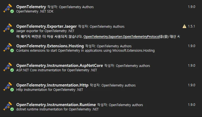 위 리스트에 있는 OpenTelemetry, Prometheus 패키지를 내려받는다.