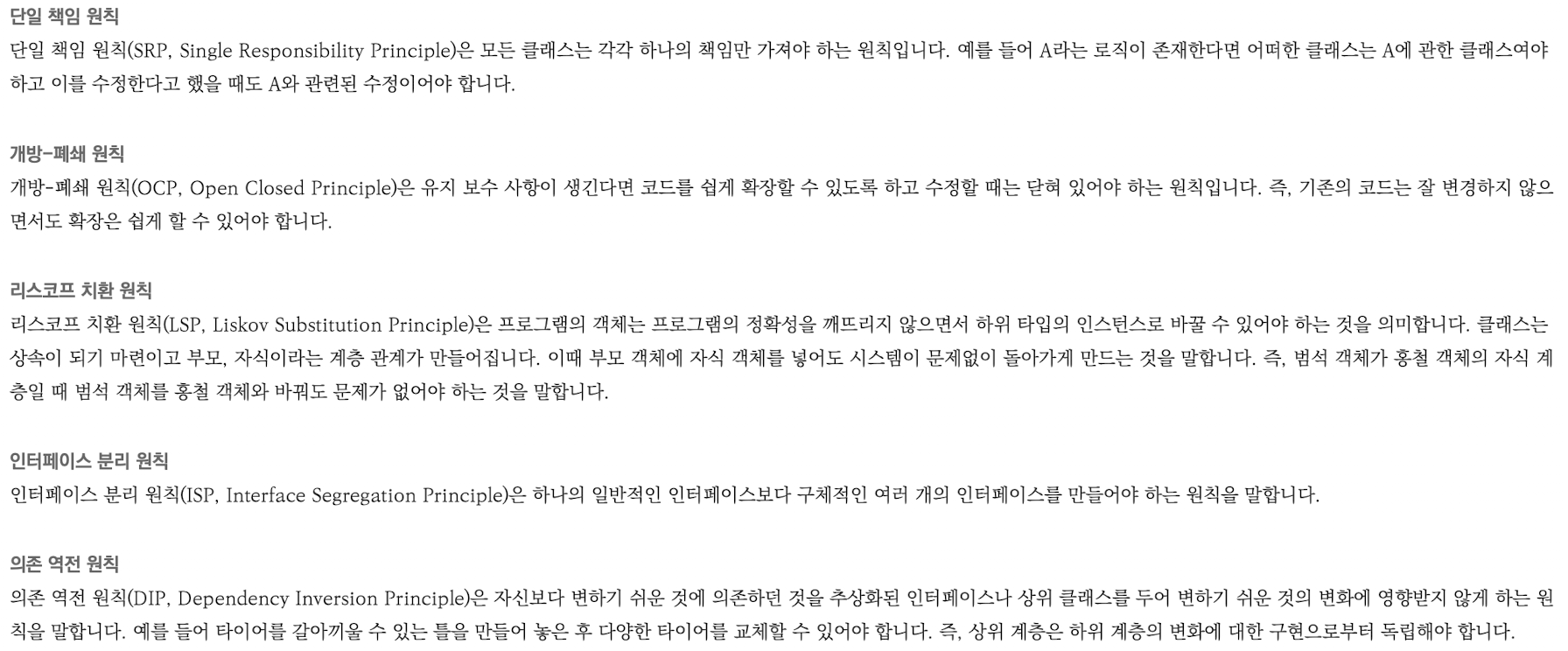 객체지향 프로그래밍을 설계할 때는 SOLID 원칙을 준수해야 한다.