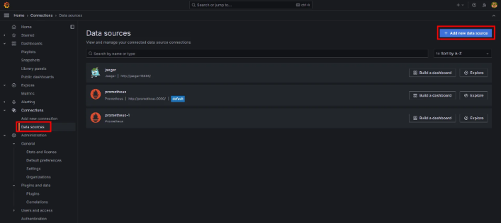 Connections > Data sources 에 들어가서 우측 상단에 있는 ‘Add new data source’를 누른다.